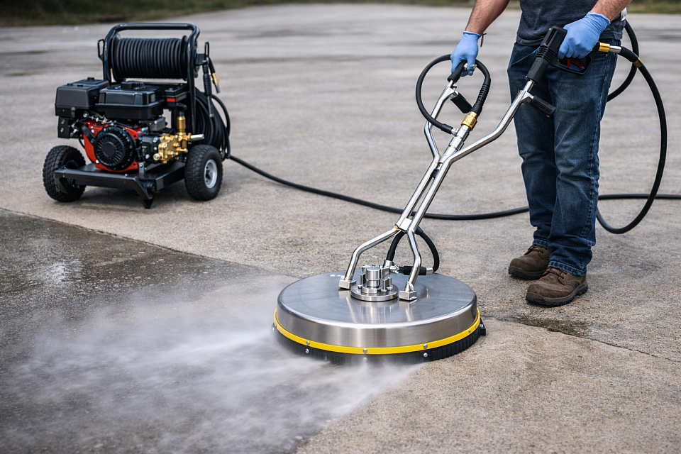 在現代建築維護中,針對大面積戶外地坪(如廣場、停車場、人行道)的清潔,使用高壓水刀搭配**專業清洗盤(Surface Cleaner)**已成為主流。相比傳統單一噴槍,此工法能提供更均勻、無條紋且極高效率的清潔效果。